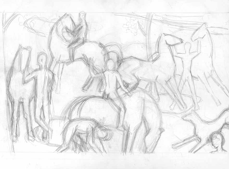 Wandteppichentwurf-Pferde u. Reiter, 1954, 24 x 39 cm, Zeichnung, Bleistift auf Zeichenpapier