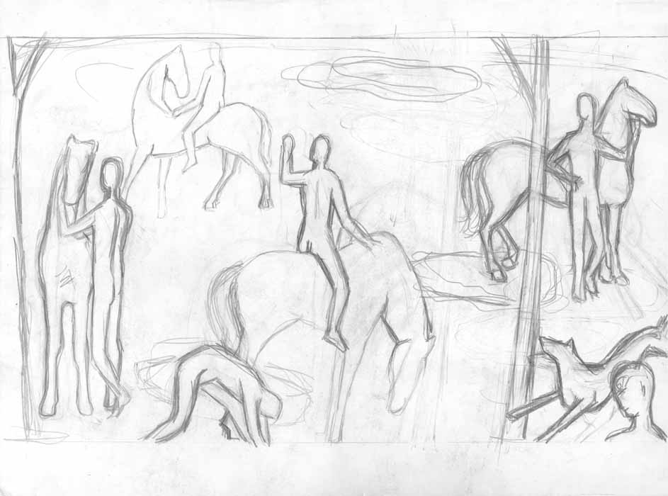 Wandteppichentwurf-Pferde u. Reiter, 1954, 24 x 39 cm, Zeichnung, Bleistift auf Zeichenpapier