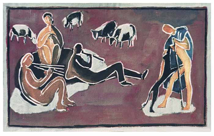 Wandteppichentwurf-Hirten u. Schaafe, 1954, 25 x 41 cm, Zeichnung, Tempera auf Büttenpapier
