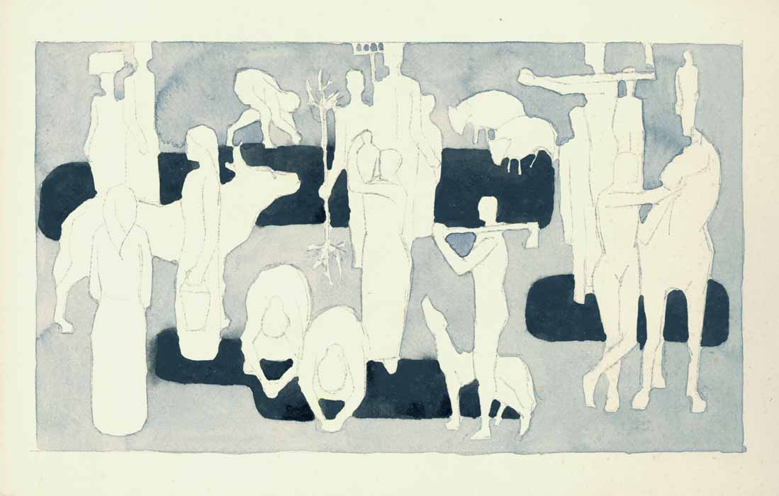 Wandteppichentwurf-Szene aus der griech. Mythologie, 1954, 16 x 27 cm, Zeichnung, Bleistift auf Büttenpapier