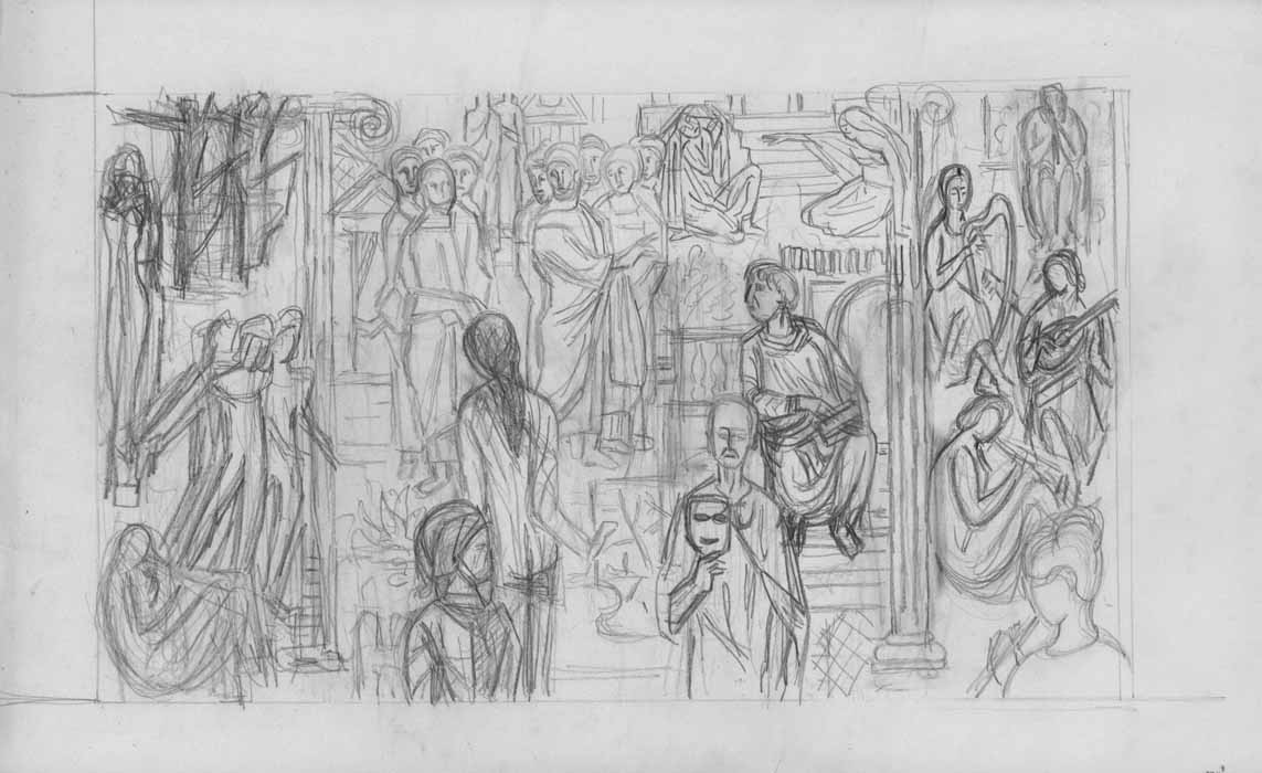 Wandteppichentwurf-Szene aus der griech. Mythologie, 1954, 24 x 41 cm, Zeichnung, Bleistift auf Zeichenpapier