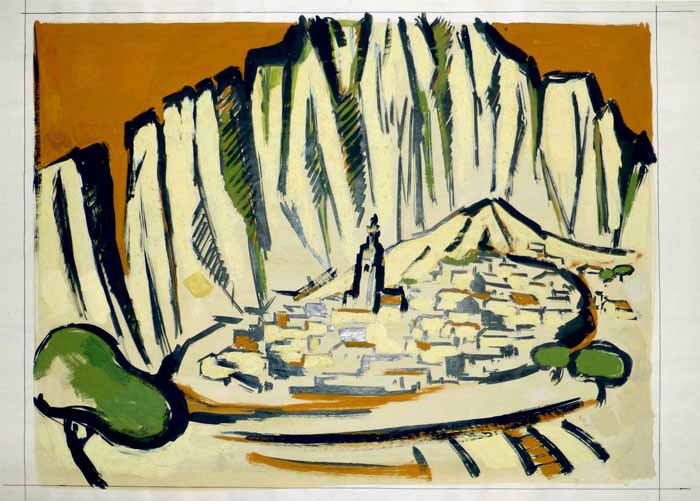 Erinnerungen an die Sierra Nevada, Spanien, 1955, 46 x 63 cm, Zeichnung; Tusche / Tempera auf beigem Karton (Entwurf zum Siebdruck)