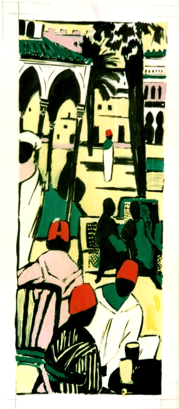 Tetuan II; 1956, 75 x 30 cm, Zeichnung; Entwurf zum Siebdruck auf Druckpapier mit Tempera und farbiger Tusche