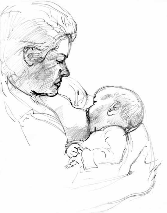 Frau M., Baby stillend, 1956, 47 x 36 cm, Zeichnung; Brauner Filzst. auf beigem Büttenpapier