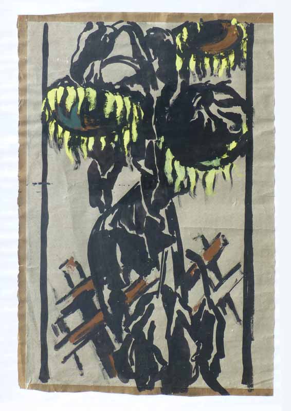 3 Sonnenblumen vor Zaun 1957, 62 x 40 cm, Zeichnung: Tusche / Tempera auf getöntem Karton