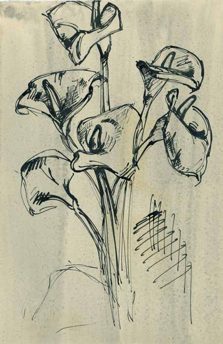 Strauß Callablüten; 1957, 42 x 26 cm, PM: 42,5 x 28 cm, Zeichnung; Schwarzer Filzstift auf grau eingetöntem beigem Zeichenkarton