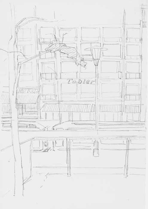 Straßenansicht in Frankfurt 1957, 29 x 21 cm, Zeichnung; Bleistift auf beigem Papier