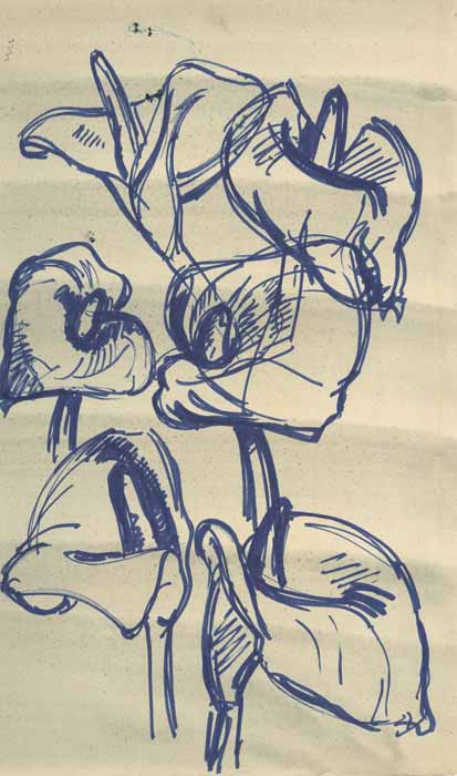 Sechs Callablüten; 1958, 45 x 27 cm, PM: 47 x 28 cm, Zeichnung; Violetter Filzstift auf grau eingetöntem beigem Zeichenkarton
