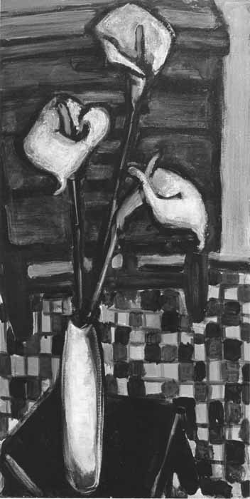 Drei Callablüten; 1958, 99 x 50 cm, Gemälde: Öl auf grundierter Hartfaserplatte