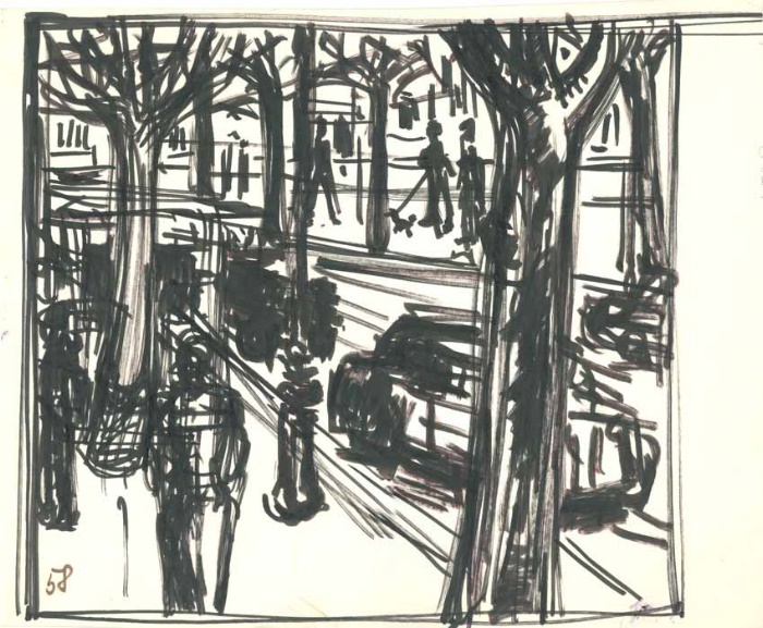 Straßenszene in der Stadt Frankfurt; 1958, 30 x 33 cm, PM: 30 x 38 cm, Zeichnung: Schwarzer und brauner Filzstift auf weißem Zeichenkarton