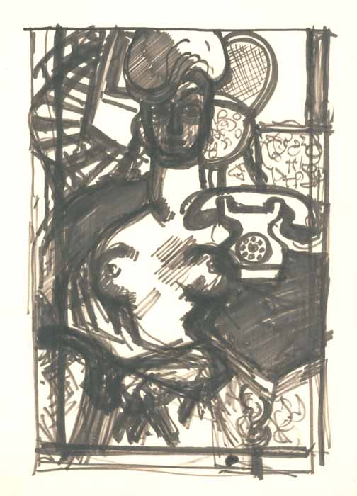 Frau mit Telefon; 1958, 26 x 19 cm, PM: 28,3 x 21 cm, Zeichnung: Schwarzer Filzstift auf weißem Zeichenblockpapier