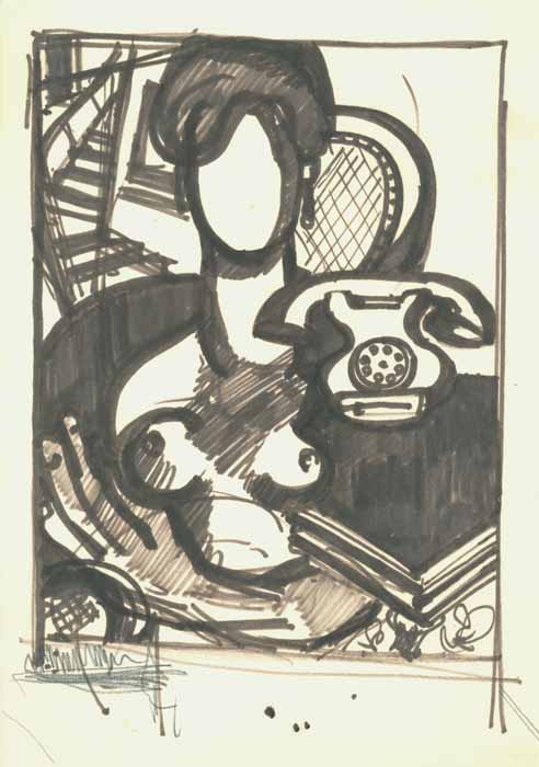 Frau mit Telefon; 1958, 25 x 17 cm, PM: 28,3 x 21 cm, Zeichnung: Brauner Filzstift auf weißem Zeichenblockpapier