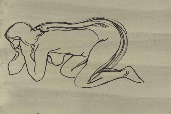 Akt knieend, Hände aufgestützt; 1958, 22 x 36 cm, PM: 28 x 42 cm, Zeichnung: Schwarzer Filzstift auf grau eingetöntem beigem Zeichenkarton