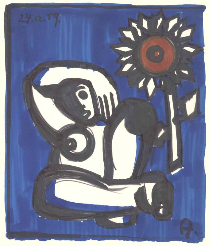 Hockende mit Sonnenblumen, 1959, 25 x 21 cm, PM: 25 x 21 cm, Zeichnung: Farbige Filzstifttuschen auf beigem Zeichenpapier