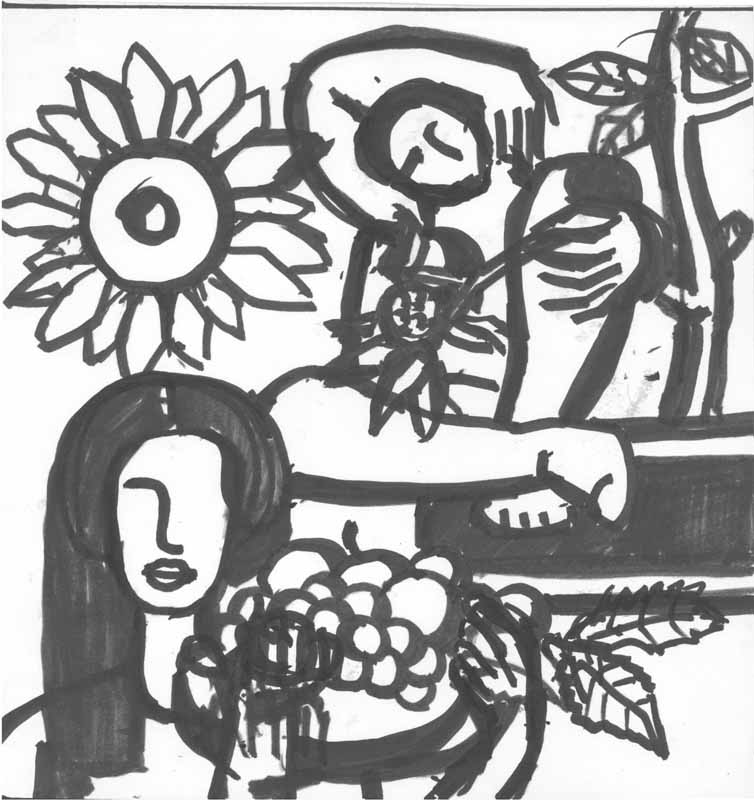 Eine Hockende u. 1 Frau mit Früchtekorb 1959, 23,0 x 22,2 cm, PM: 23,5 x 22,2 cm, Zeichnung: Schwarze Filzstifttusche auf beigem Zeichenkarton
