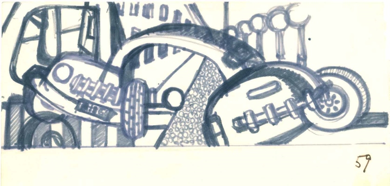 Autofragmente und Straße, 1959, 13 x 28 cm, PM: 21 x 28,2 cm, Zeichnung: Schwarze Filzstifttusche auf beigem Zeichenblockpapier
