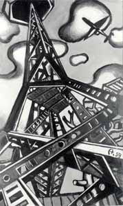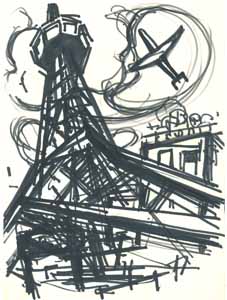 Funkturm, 1959, Maße: 28,4 x 21 cm, PM: 28,4 x 21 cm, Zeichnung: Schwarze Filzstifttusche auf beigem Zeichenblockpapier, Reg.Nr.: Z 59 - 08/04 - 01