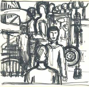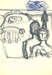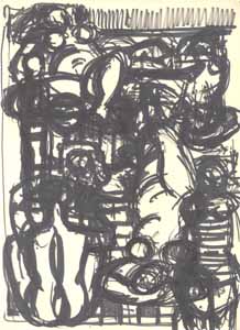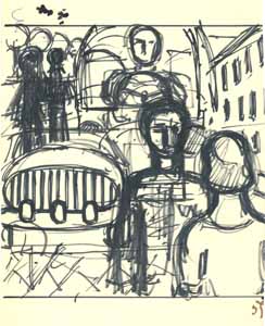 Menschen und Autos, 1959, Maße: 21,5 x 21,2 cm, PM: 30,5 x 21,2 cm, Zeichnung: Schwarze Filzstifttusche auf beigem Zeichenblockpapier, Erbeng. Arndt - Reg.Nr.: E 59 - 22/02 - 21