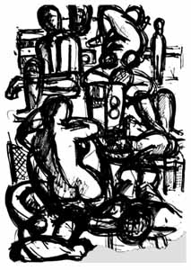 Menschen und Autos i.d. Stadt, 1959, Maße: 21 x 22 cm, PM: 30,5 x 22,4 cm, Zeichnung; Schwarze Filzstifttusche auf beigem Zeichenblockpapier, dat. ru "59" - Reg.Nr.: Z 59 - 03/19 - 23
