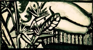 Frau im Baum, 1959, Maße: 183 x 100 cm, Gemälde: Öl auf grundierter Spanplatte (unvollendet), Privatbesitz: Galerie maerklin Reg.Nr.: B 59 - 50/85 - 09