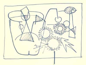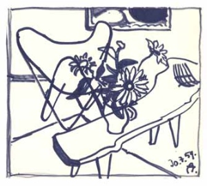 Fledermausstuhl und Tisch mit Sonnenblumen, 1959, Maße: 21 x 24 cm, PM: 21 x 24 cm, Zeichnung: Schwarze Filzstifttusche auf beigem Zeichenpapier, sign. u. dat. ru "30.7.59. A" Reg.Nr.: Z 59 - 32/12 - 10