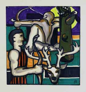 2 Bogenschützen und Rehbock, 1959, Maße: 23,7 x 22,5 cm, PM: 23,7 x 22,5 cm, Zeichnung: Farbige Filzstifttuschen auf beigem Zeichenpapier auf Karton aufgezogen, sign. ru "A" Reg.Nr.: Z 59 - 23/04 - 15