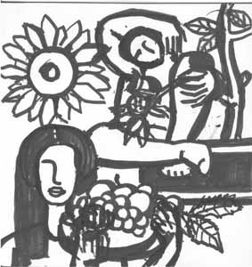 2 Frauen mit Sonnenblume und Früchtekorb, 1959, Maße: 20 x 25,5 cm, PM: 21 x 30,5 cm, Zeichnung: Schwarze Filzstifttusche auf beigem Zeichenpapier, Reg.Nr.: Z 59 - 23/01 - 11