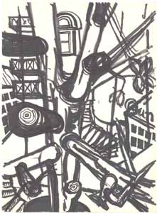 Baum und Stadt, 1959, Maße: 30,5 x 22 cm, PM: 30,5 x 22 cm, Zeichnung: Schwarze Filzstifttusche auf beigem Zeichenkarton, sign. und dat. auf RS ol: "1. Blatt 31./12./59 A." Reg.Nr.: Z 59 - 08/05 - 20