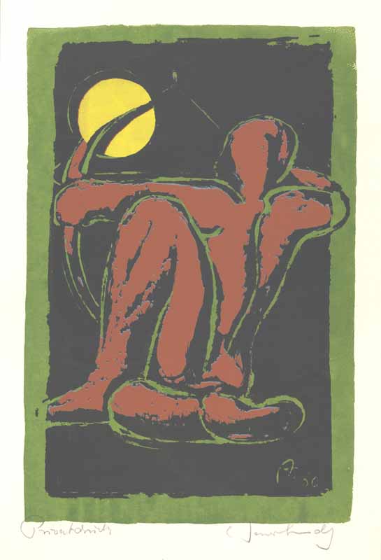 Bogenschütze, schwarz, graublau, rot und mit gelbem Mond, 1960; Maße: 35 x 23 cm,Druckgraphik: Siebdruck auf Büttenpapier