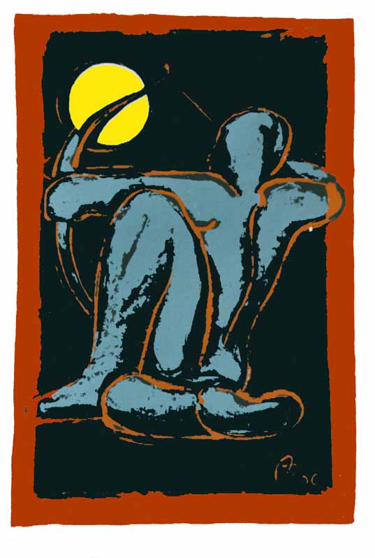 Bogenschütze, graublau, schwarz mit gelbem Mond, roter H, 1960; Maße: 35 x 23 cm,Druckgraphik: Siebdruck auf Büttenpapier