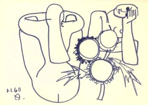 Auto, 1960; Maße: 32 x 24 cm, Graphik: Handzeichnung, Tusche auf Zeichenpapier; sign. u. dat. r.u. 25.I.60 A. und auf RS: 4/II. 29/I/60 A., sign. u. dat.(RS 4/II 29/1/60) Erbeng. Arndt - Reg. Nr.: E60 - 09/26 - 11