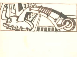 Autoelemente und Straße, 1960; Maße: 12 x 28 cm, Graphik: Handzeichnung, Tusche auf Zeichenpapier; Erbeng. Arndt - Reg. Nr.: E60 - 03/22 - 03
