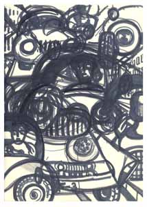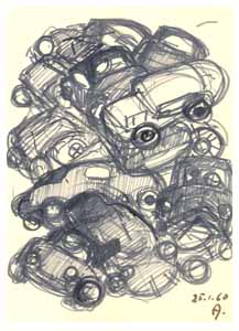 Auto 3, 1960; Maße: 30 x 22 cm, Graphik: Handzeichnung, Tusche auf Zeichenpapier; sign. u. dat. auf RS: "Auto" 3/I. A 20/I/60), Erbeng. Arndt - Reg. Nr.: E60 - 09/25 - 07