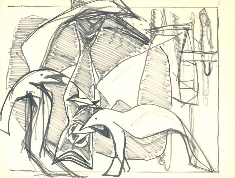 2 Möwen und Fisch, 1961; Maße: 30 x 36 cm,Graphik: Handzeichnung: Tusche auf Zeichenpapier