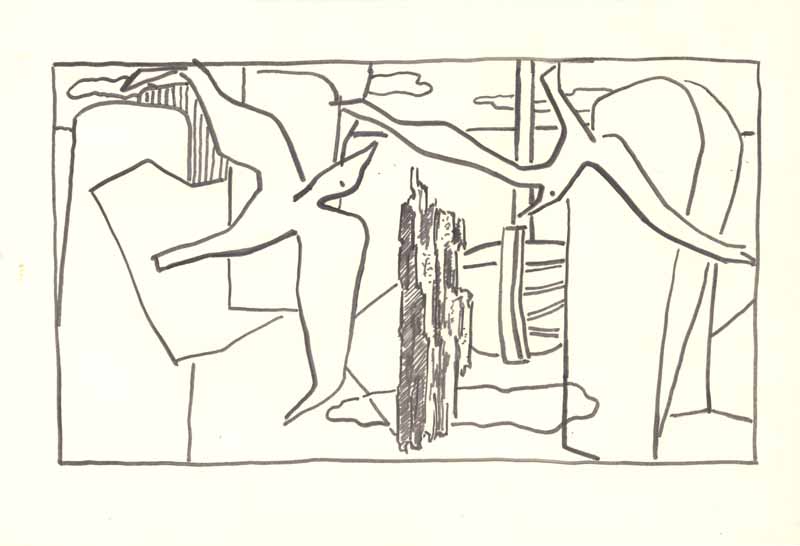 2 Möwen, Strandkörbe u. Holzstück, 1961; Maße: 20 x 34 cm,Graphik: Handzeichnung: Tusche auf Zeichenpapier