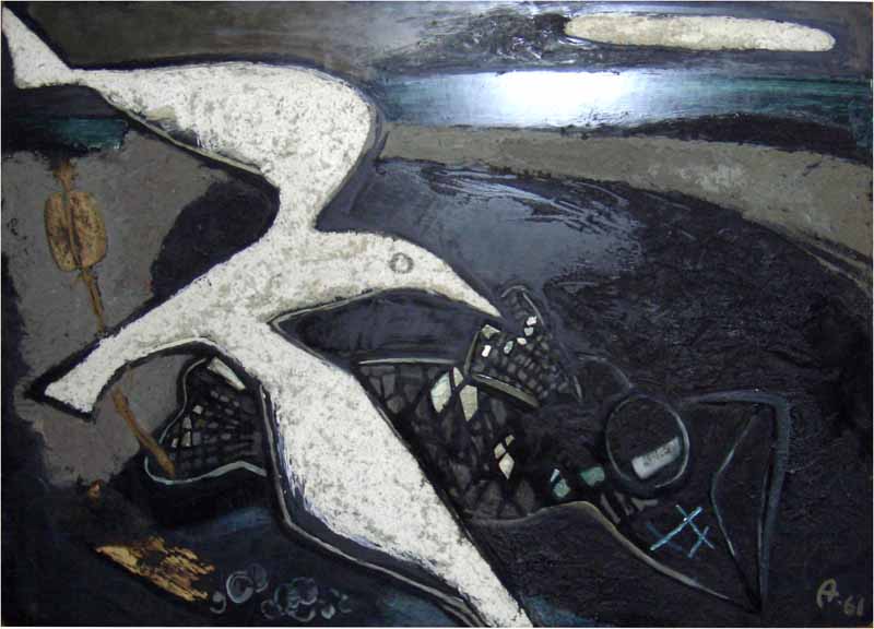 Möwe und Fisch II, 1961; Maße: 90 x 130 cm,Gemälde: Öl- und Dispersionsfarbe, stark strukturiert, auf Spanplatte