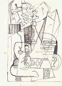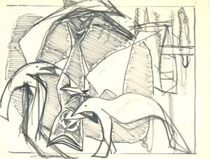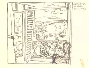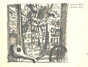 Balkonfenster in südl. Landschaft, 1961; Maße: 28 x 35 cm, Graphik: Handzeichnung: Tusche auf Zeichenpapier; Entwurf zu einer Ausschreibung der BRD für eine künstlerische Ausgestaltung einer Kasernenunterkunft in Rotenburg/Fulda, Erbeng. Arndt - Reg. Nr.: Z61 - 04/31