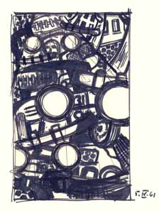 Großstadtromantik, 1961; Maße: 27 x 34 cm, Graphik: Handzeichnung: Tusche auf Zeichenpapier; Entwurf zu einer Ausschreibung der BRD für eine künstlerische Ausgestaltung einer Kasernenunterkunft in Rotenburg/Fulda, Erbeng. Arndt - Reg. Nr.: Z61 - 21/02