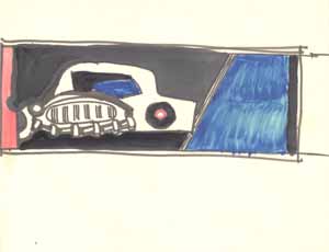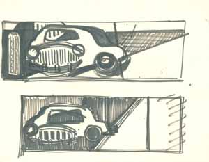 Auto vor blauer Straße, 1961; Maße: 14 x 37 cm, Graphik: Handzeichnung: Tusche auf Zeichenpapier; Erbeng. Arndt - Reg. Nr.: Z61 - 06/32