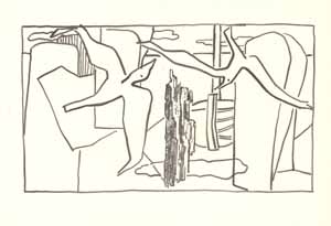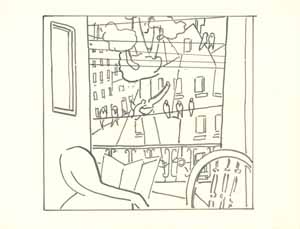 Blick aus dem Fenster, 1961; Maße: 25,5 x 28 cm, Graphik: Handzeichnung: Tusche auf Zeichenpapier; Entwurf zu einer Ausschreibung der BRD für eine künstlerische Ausgestaltung einer Kasernenunterkunft in Rotenburg/Fulda, Erbeng. Arndt - Reg. Nr.: Z61 - 04/30