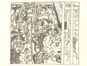 Cafe in südl. Stadt,1961; Maße: 28 x 35 cm, Graphik: Handzeichnung: Tusche auf Zeichenpapier; Entwurf zu einer Ausschreibung der BRD für eine künstlerische Ausgestaltung einer Kasernenunterkunft in Rotenburg/Fulda, Erbeng. Arndt - Reg. Nr.: Z61 - 21/04