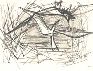 2 Möwen, Strandgräser und Meer, 1961; Maße: 30 x 40 cm, Graphik: Handzeichnung: Tusche/ Wachsfarben in Absprengtechnik auf Zeichenkarton; sign. ru "A." Privatbesitz: F. A., Griesheim - Reg. Nr.: Z61 - 32/09a