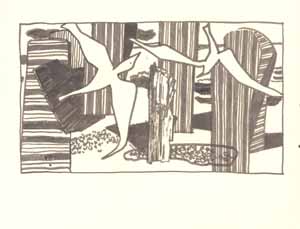 2 Möwen, Strandkörbe u. Holzstück, 1961; Maße: 20 x 34 cm, Graphik: Handzeichnung: Tusche auf Zeichenpapier; Erbeng. Arndt - Reg. Nr.: E61 - 03/39