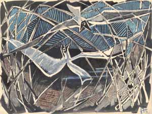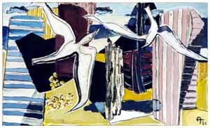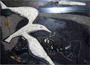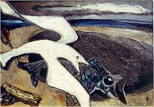 Möwe und Fisch II, 1961; Maße: 90 x 130 cm, Gemälde: Öl- und Dispersionsfarbe, stark strukturiert, auf Spanplatte; sign. ru "A", Privatbesitz: Fam. A., Griesheim - Reg. Nr.: B61 - 29/33