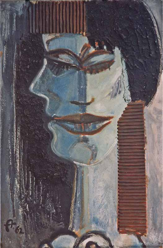 Kopfvariation von Christine, 1962; Maße: 64 x 42 cm,Collage: Putz, Wellpappe, Öl- und Acrylfarbe auf Spanplatte