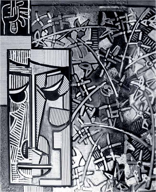 Forsythie und Gesicht, 1962; Maße: 107 x 90 cm,Collage Putz, WellpappeÖl- Acrylfarbe auf Schultafel