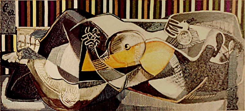 Liegendes Paar , 1962; Maße: 89 x 210 cm,Collage: Putz, Styropor, Stoff: Öl-, Acrylfarbe auf Spanplatte
