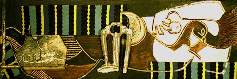 Menschenpaar mit Stuhl, 1962; Maße: 46 x 143 cm,Collage: Putz, Styropor, Stoff, Öl-, Acrylfarbe auf Spanplatte