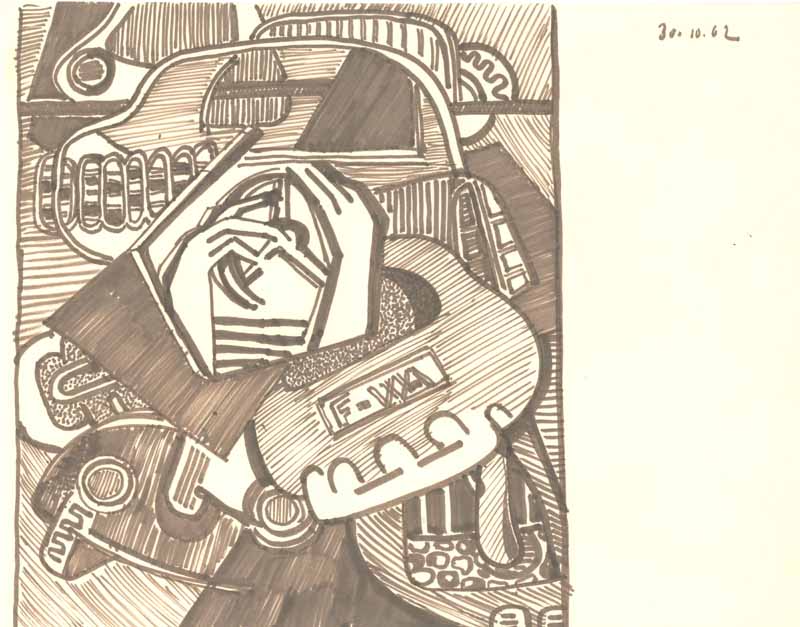 Auto und Stadt F-W.A, 1962; Maße: 30 x 38 cm,Graphik: Handzeichnung: Tusche auf Zeichenpapier
