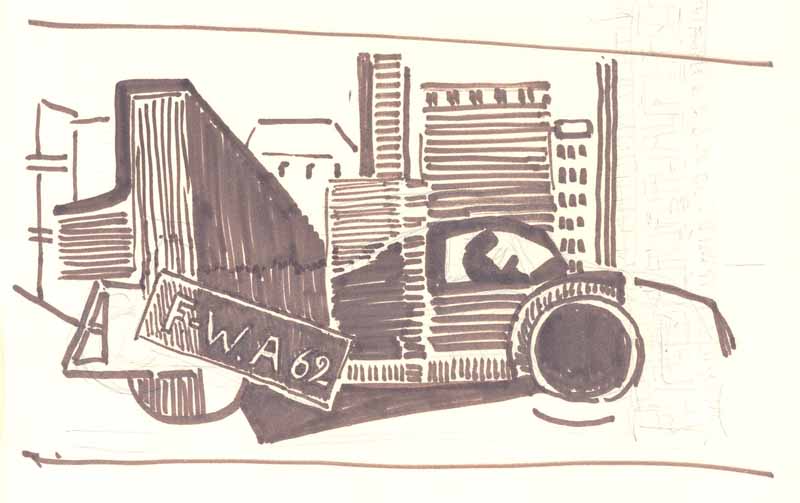 Stadt und Auto F-W.A 62, 1962; Maße: 18 x 29 cm,Graphik: Handzeichnung: Tusche auf Zeichenpapier